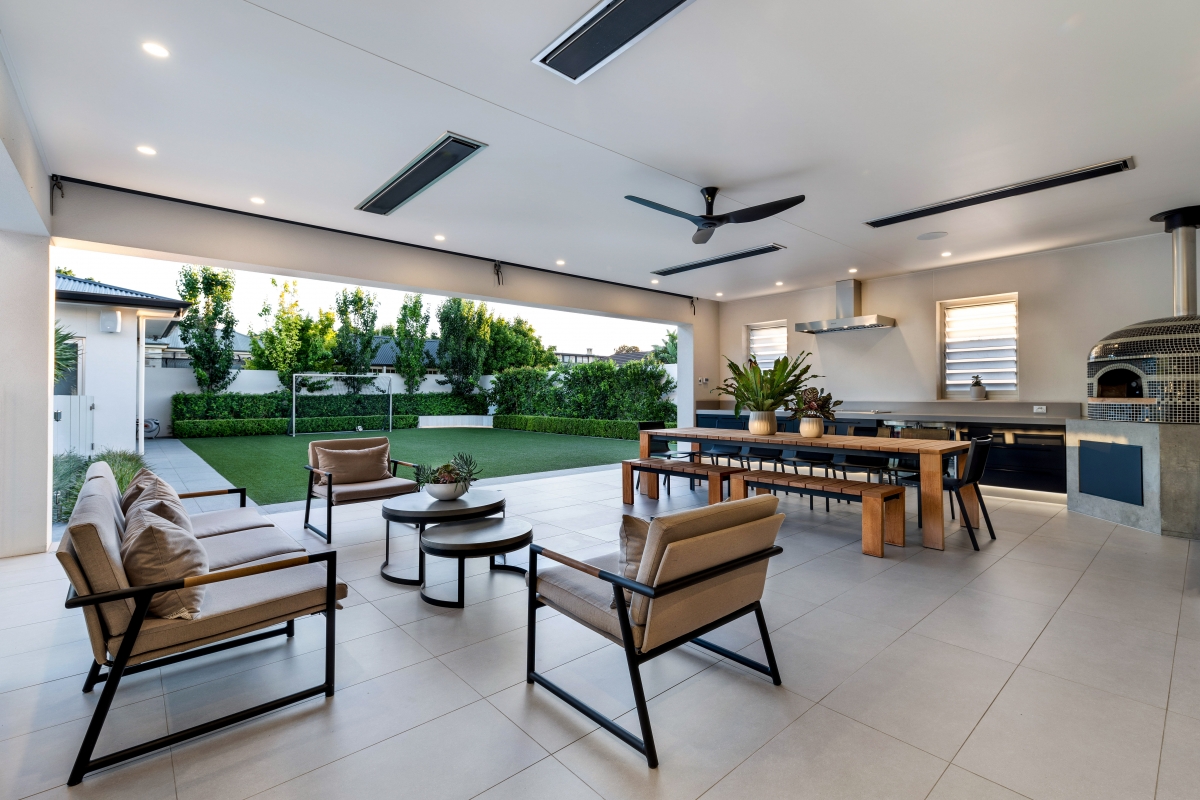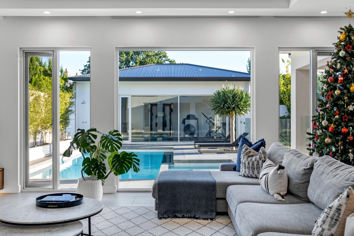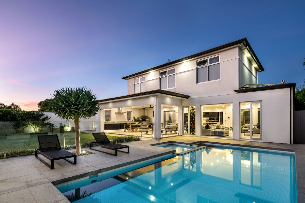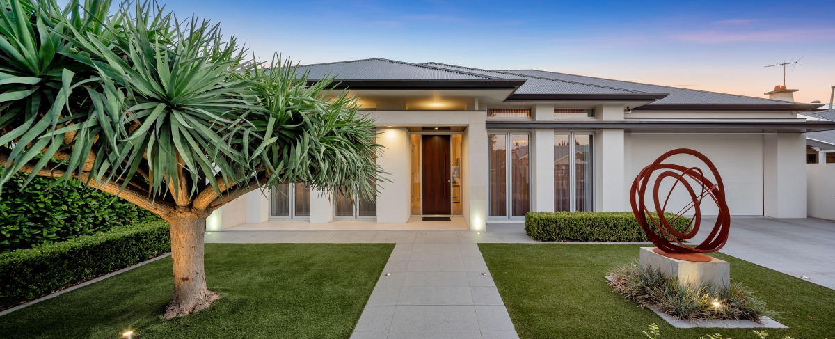 This exquisite Prospect residence blends contemporary elegance with architectural refinement. The striking façade features a dark-toned roof, beautifully contrasted by natural limestone and deep-recessed windows, creating a bold yet harmonious aesthetic. Dark trim accents the window canopies, while complementing highlight windows enhance the home’s sleek, linear elevation. Designed to seamlessly integrate with the streetscape, the home presents as a sophisticated single-storey dwelling, with a discreet two-storey section at the rear and a lower basement for added functionality.