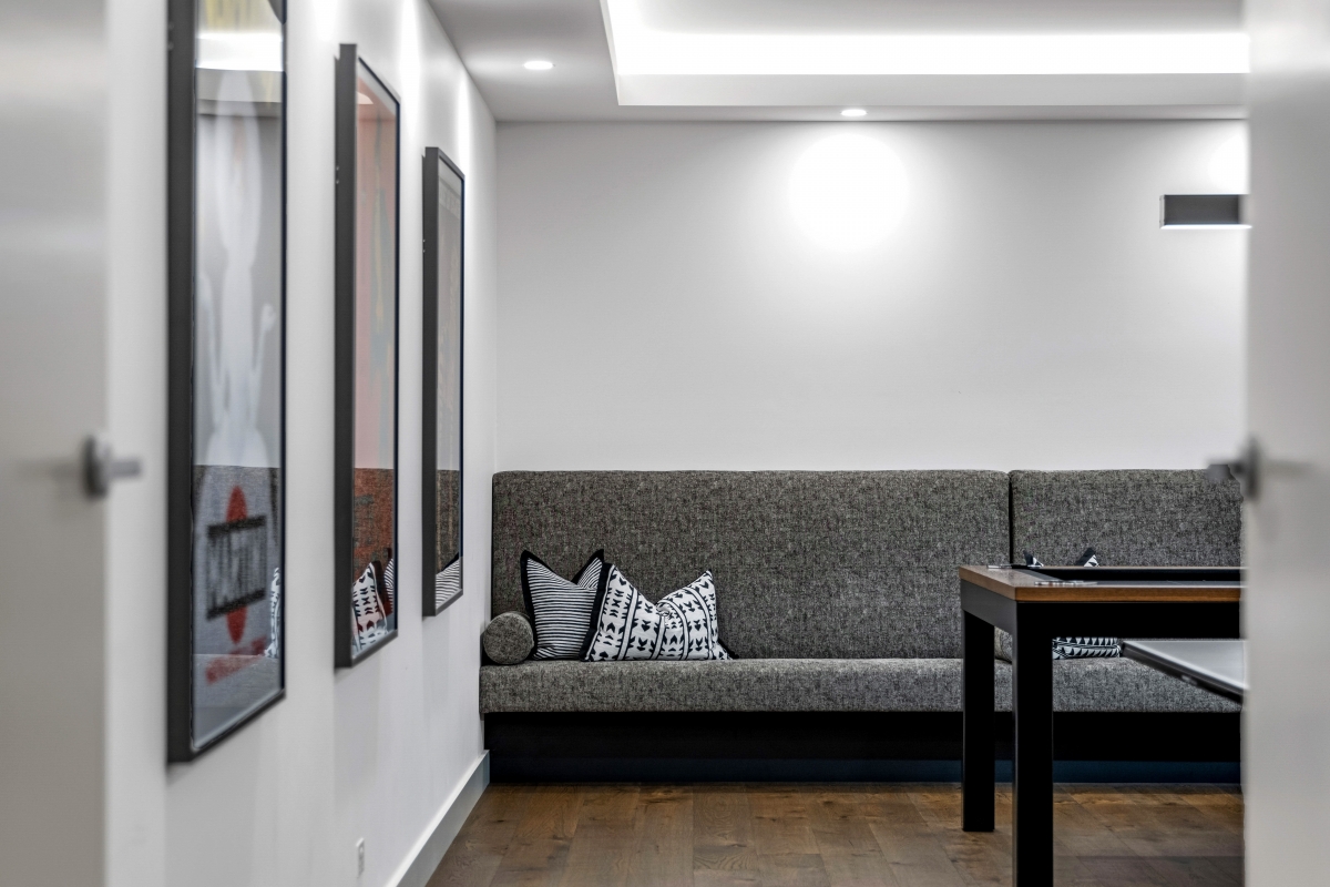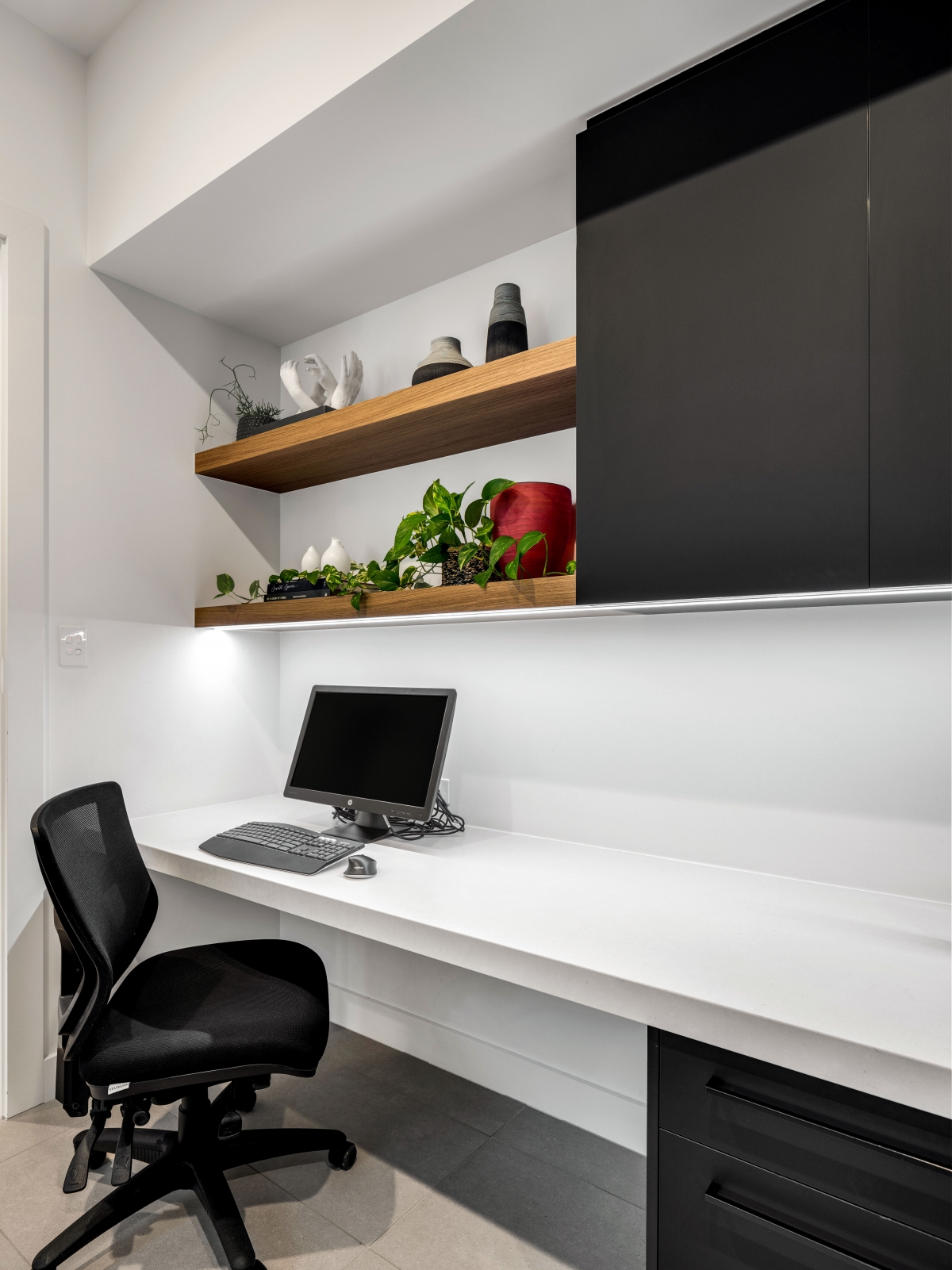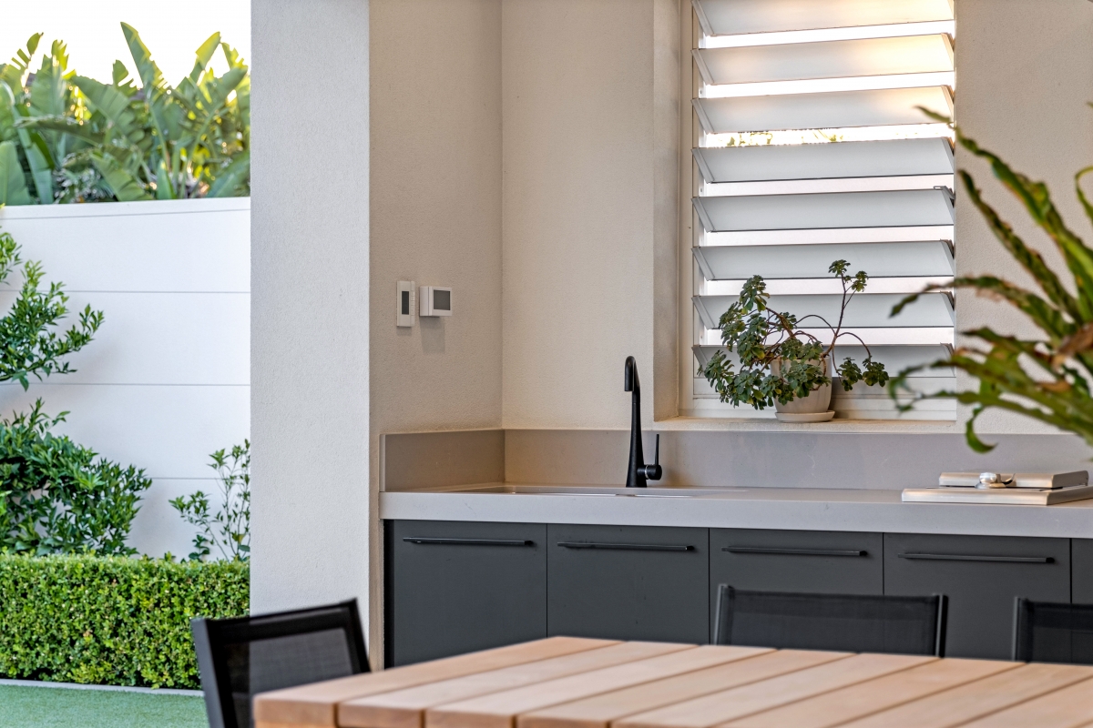 This exquisite Prospect residence blends contemporary elegance with architectural refinement. The striking façade features a dark-toned roof, beautifully contrasted by natural limestone and deep-recessed windows, creating a bold yet harmonious aesthetic. Dark trim accents the window canopies, while complementing highlight windows enhance the home’s sleek, linear elevation. Designed to seamlessly integrate with the streetscape, the home presents as a sophisticated single-storey dwelling, with a discreet two-storey section at the rear and a lower basement for added functionality.