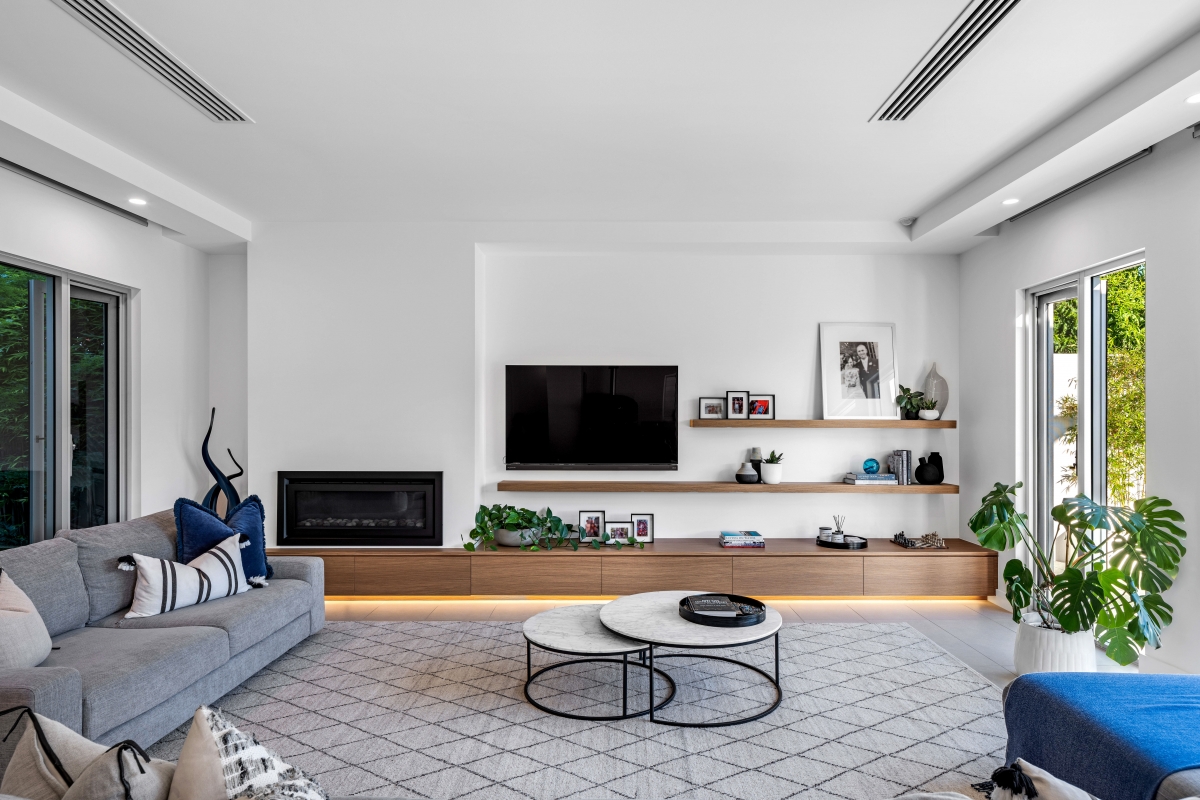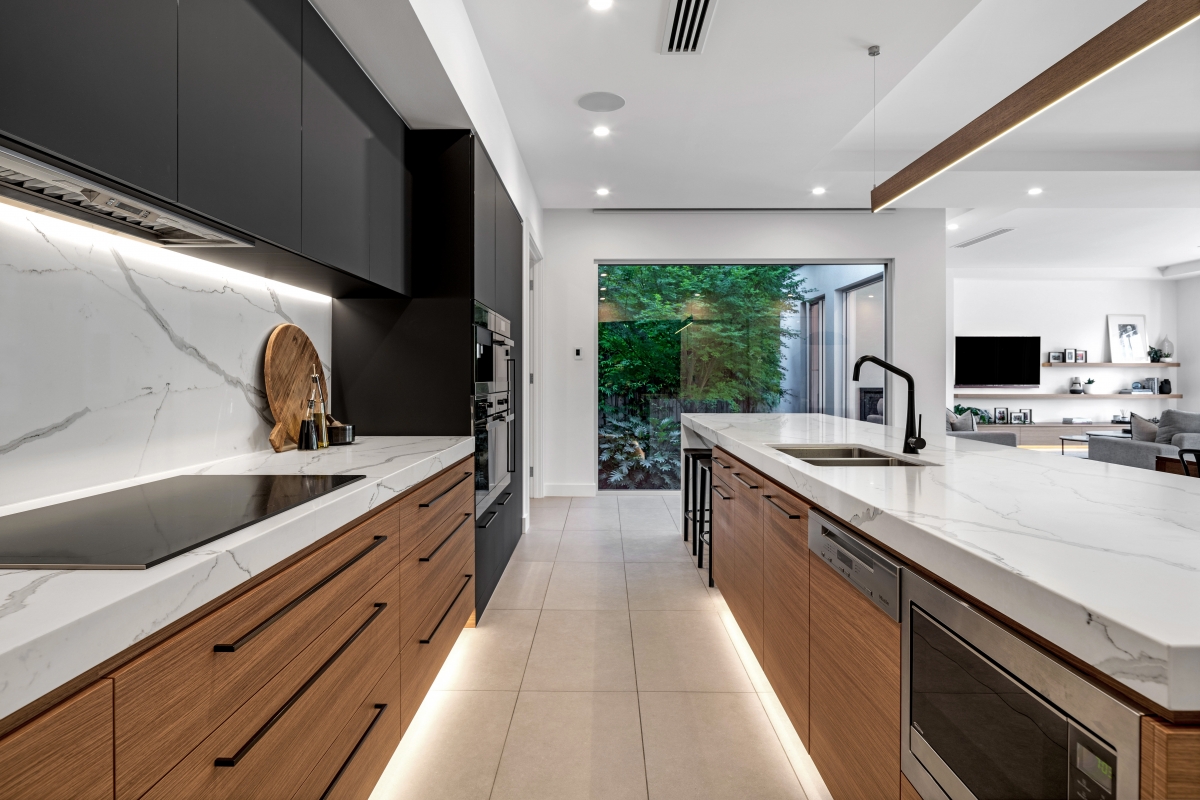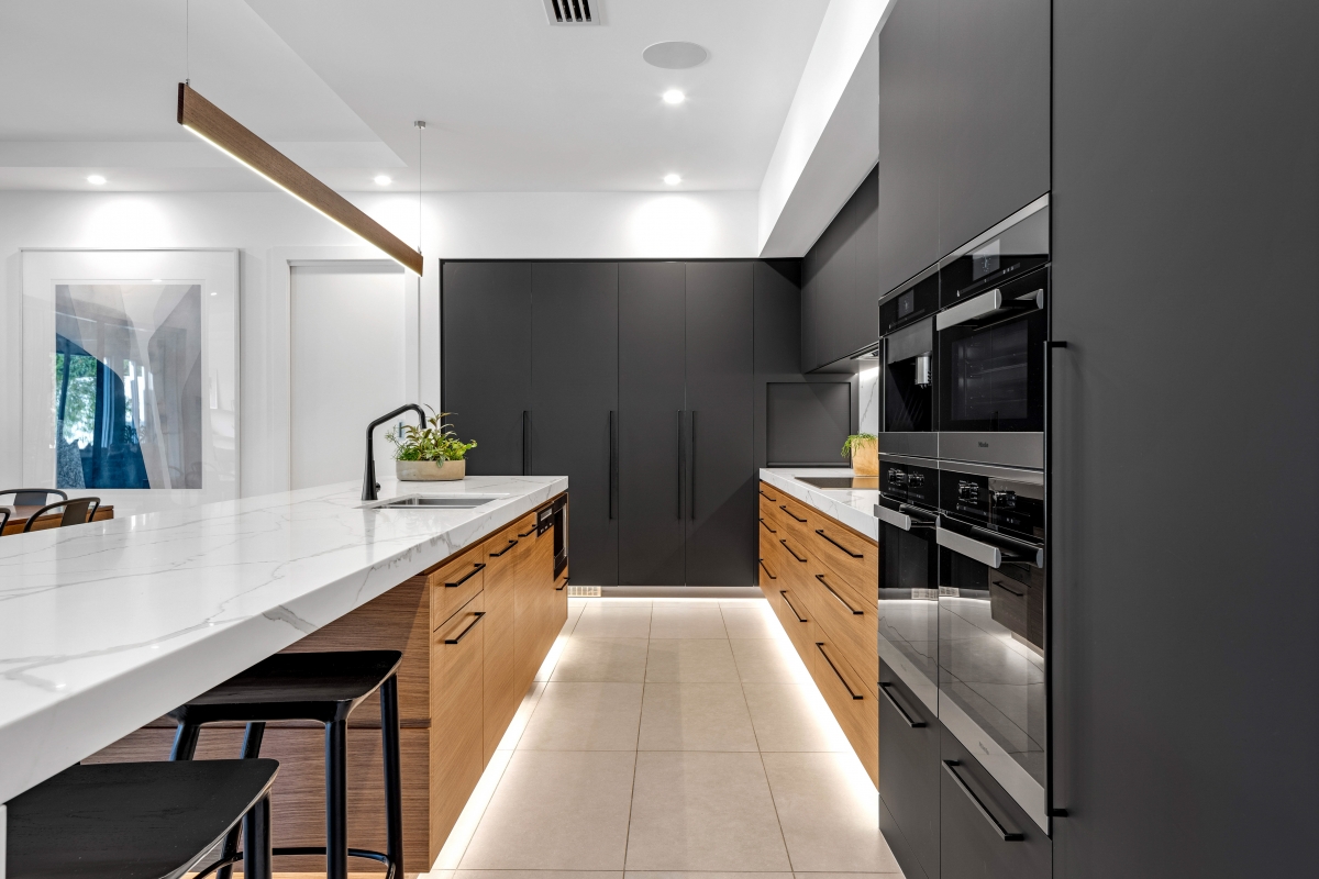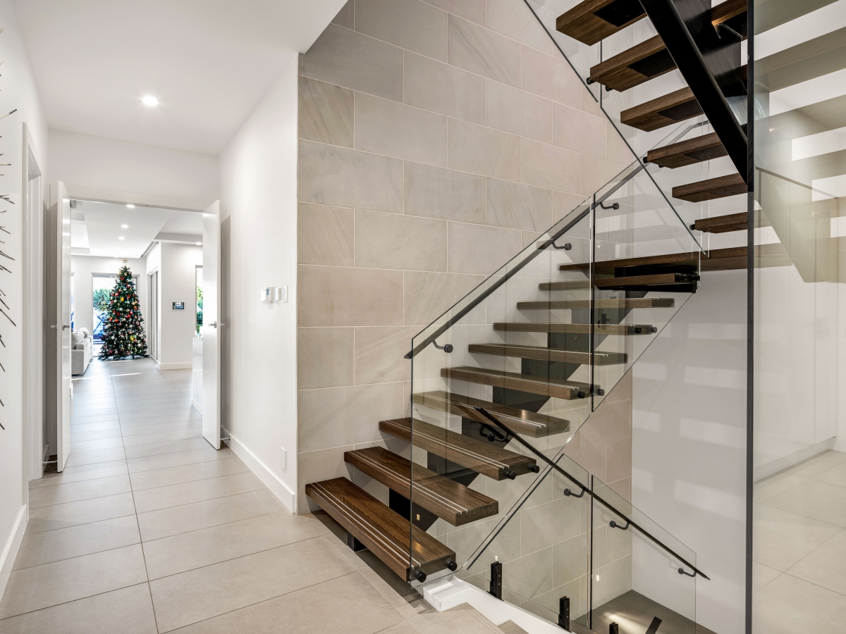 Inside, luxury and innovation converge. The basement level is dedicated to leisure, with a state-of-the-art home theatre and expansive games room. On the ground level, a bespoke dark-toned kitchen with warm timber drawers serves as the heart of the home, flowing effortlessly into a grand outdoor entertaining terrace, complete with a pool and private gymnasium. A show stopping internal staircase, with timber treads and a glass balustrade set against a striking stone-clad wall, stands as a testament to craftsmanship and design excellence.