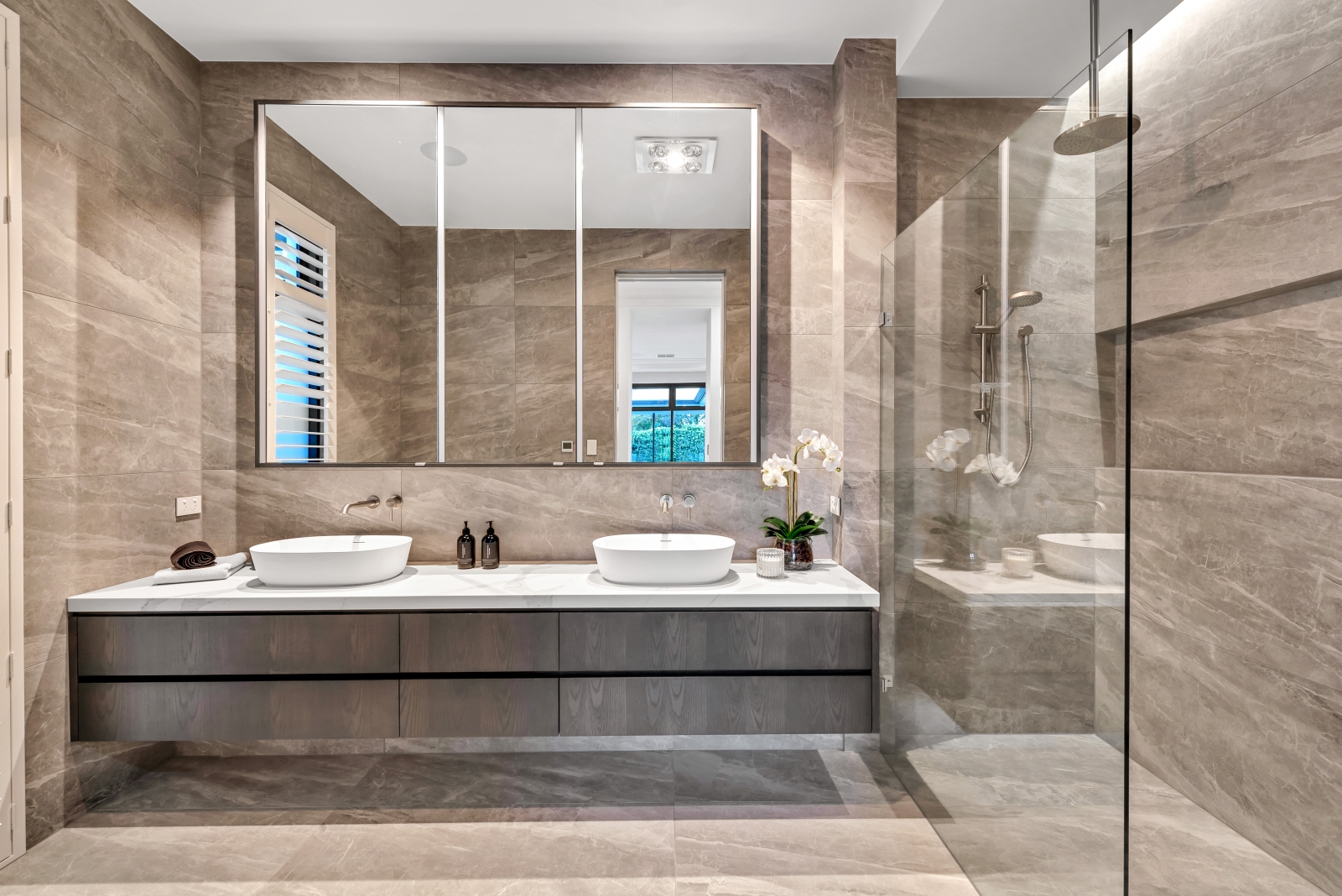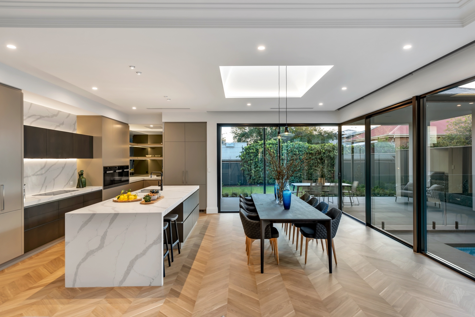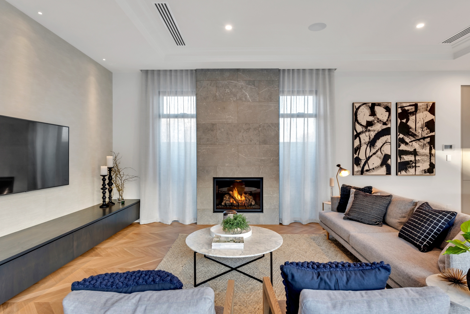 This exceptional Samuel James-built home showcases modern luxury with architectural elegance and functional design. Its striking two-storey façade features wide, weather-protecting eaves for both style and practicality, while slender recessed windows allow natural light in without compromising privacy. A refined mix of rich stone and walnut-stained shiplap timber creates a warm yet commanding presence, ensuring timeless appeal.
