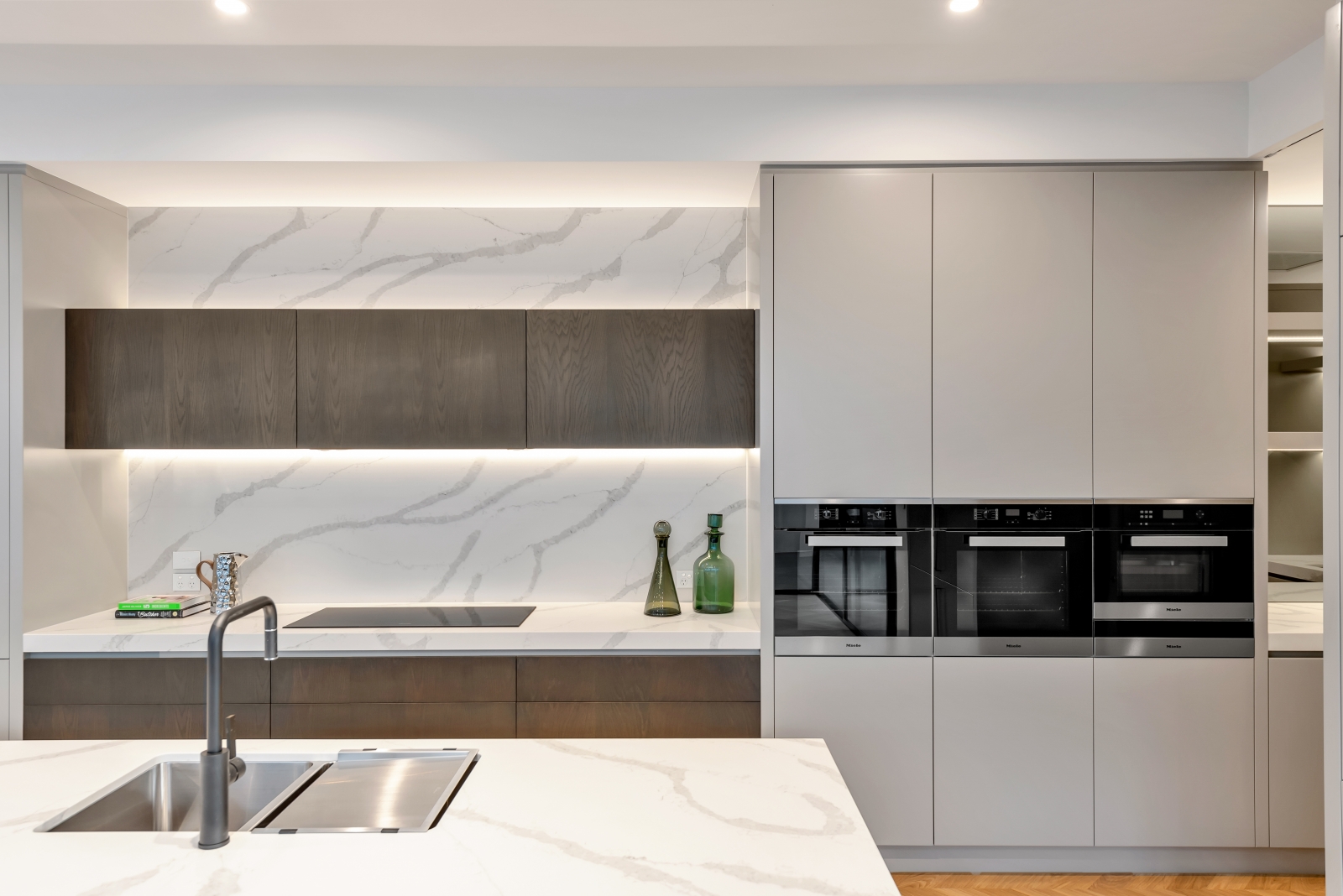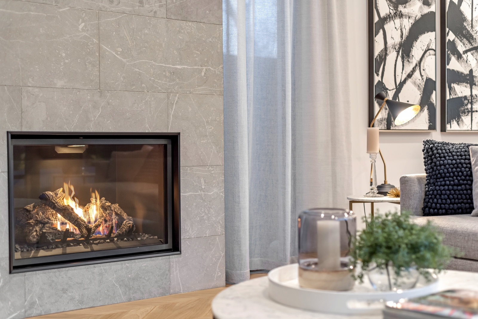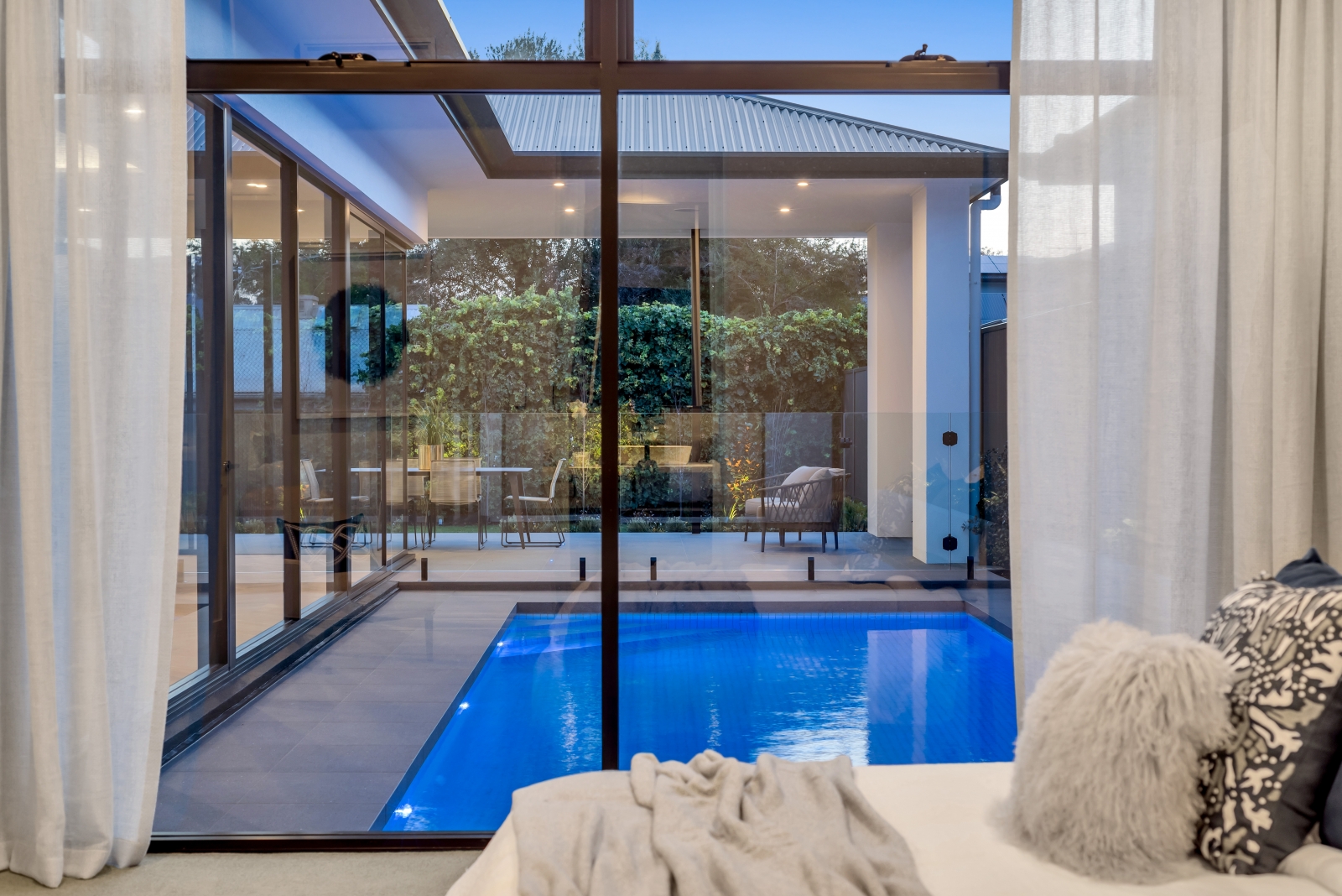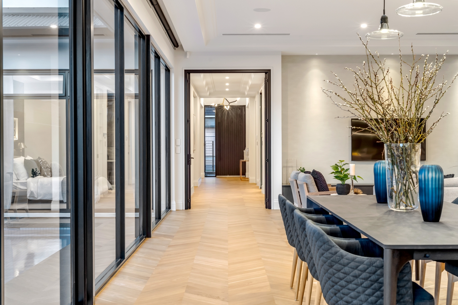 This exceptional Samuel James-built home showcases modern luxury with architectural elegance and functional design. Its striking two-storey façade features wide, weather-protecting eaves for both style and practicality, while slender recessed windows allow natural light in without compromising privacy. A refined mix of rich stone and walnut-stained shiplap timber creates a warm yet commanding presence, ensuring timeless appeal.