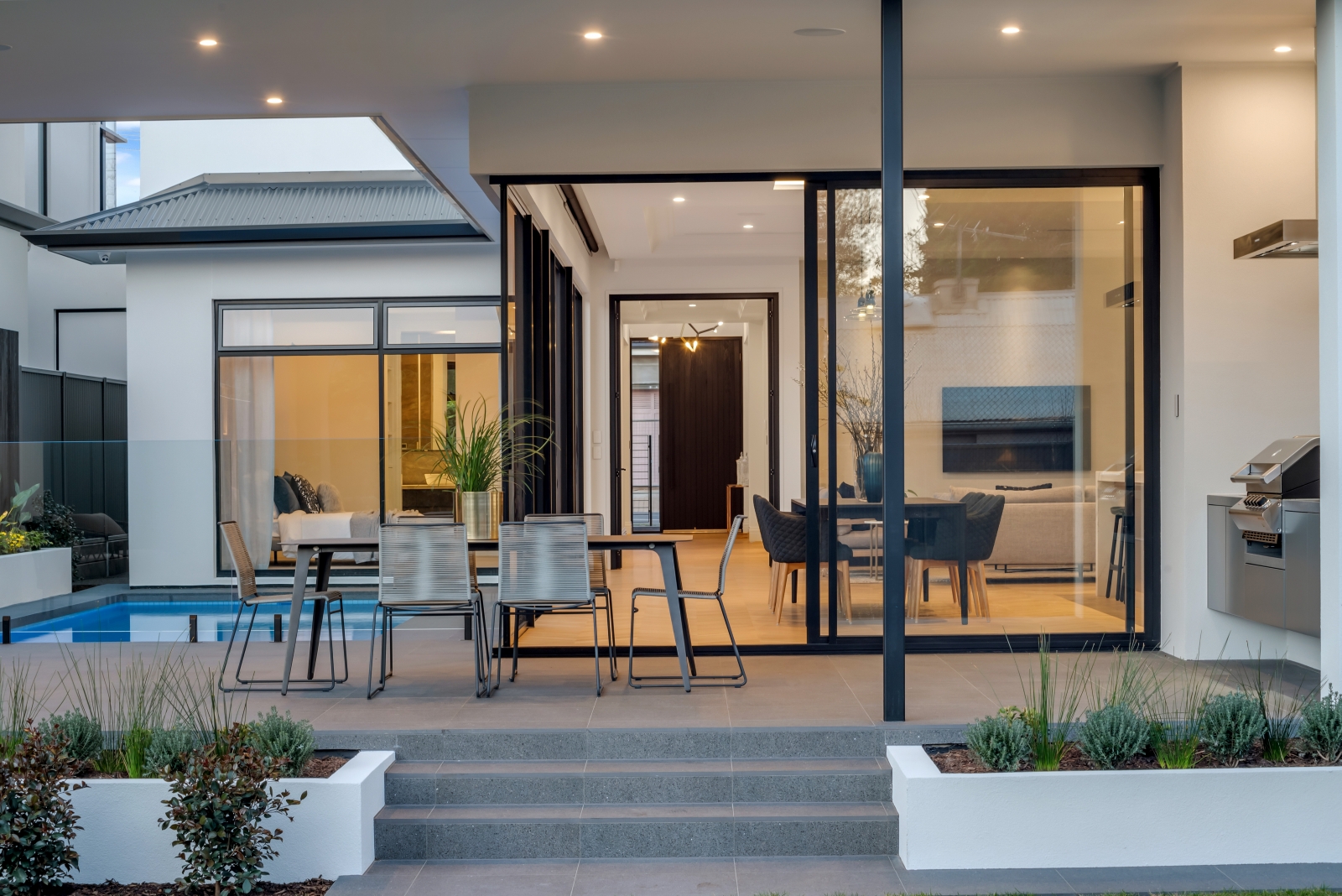 Meticulously crafted, the exterior’s balance of textures and tones enhances durability and complements the natural surroundings. Recessed lighting and sleek architectural lines add to its bold yet inviting aesthetic. Designed for both comfort and visual impact, this home reflects Samuel James’ dedication to quality and innovation, setting a new standard in contemporary living.